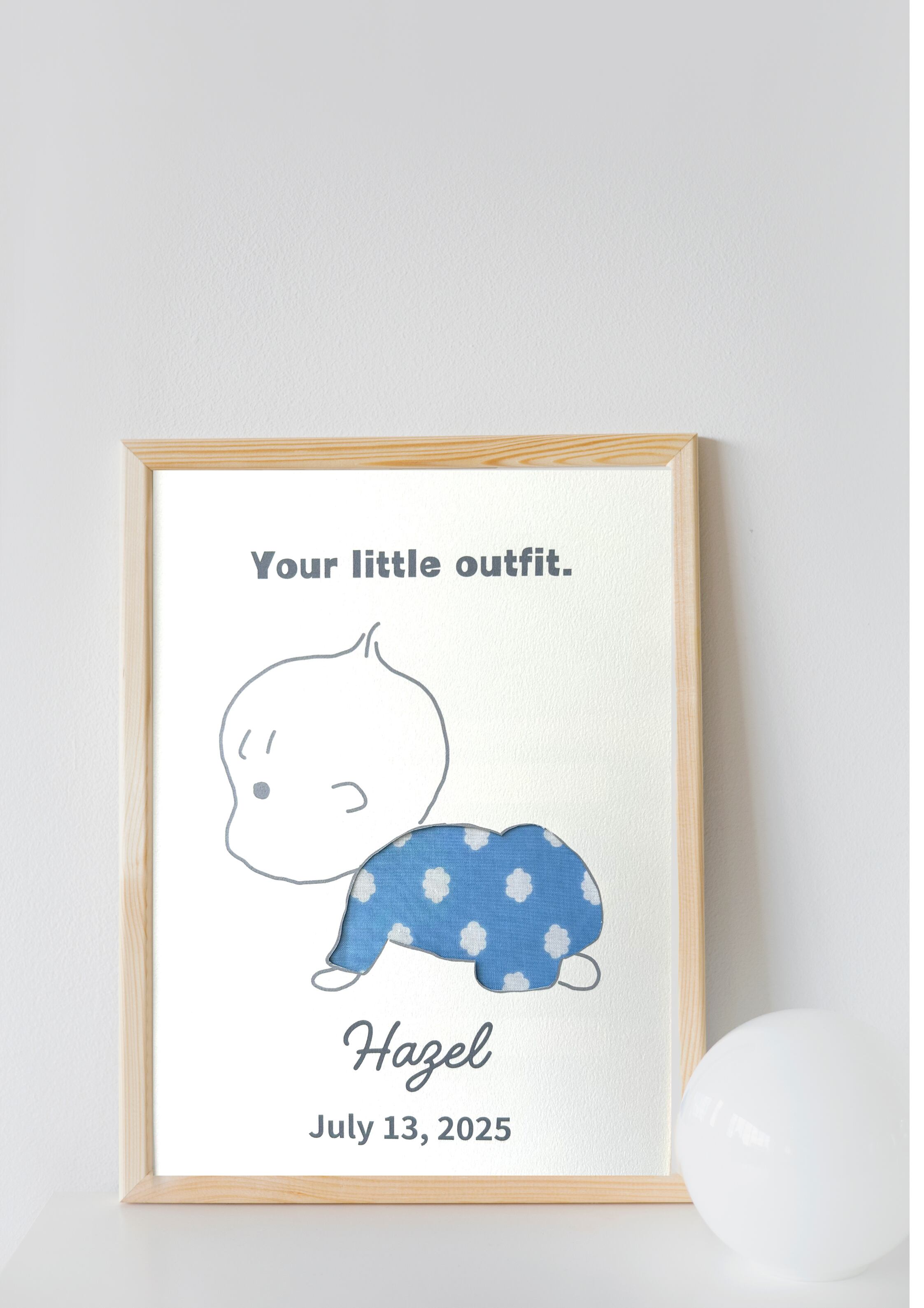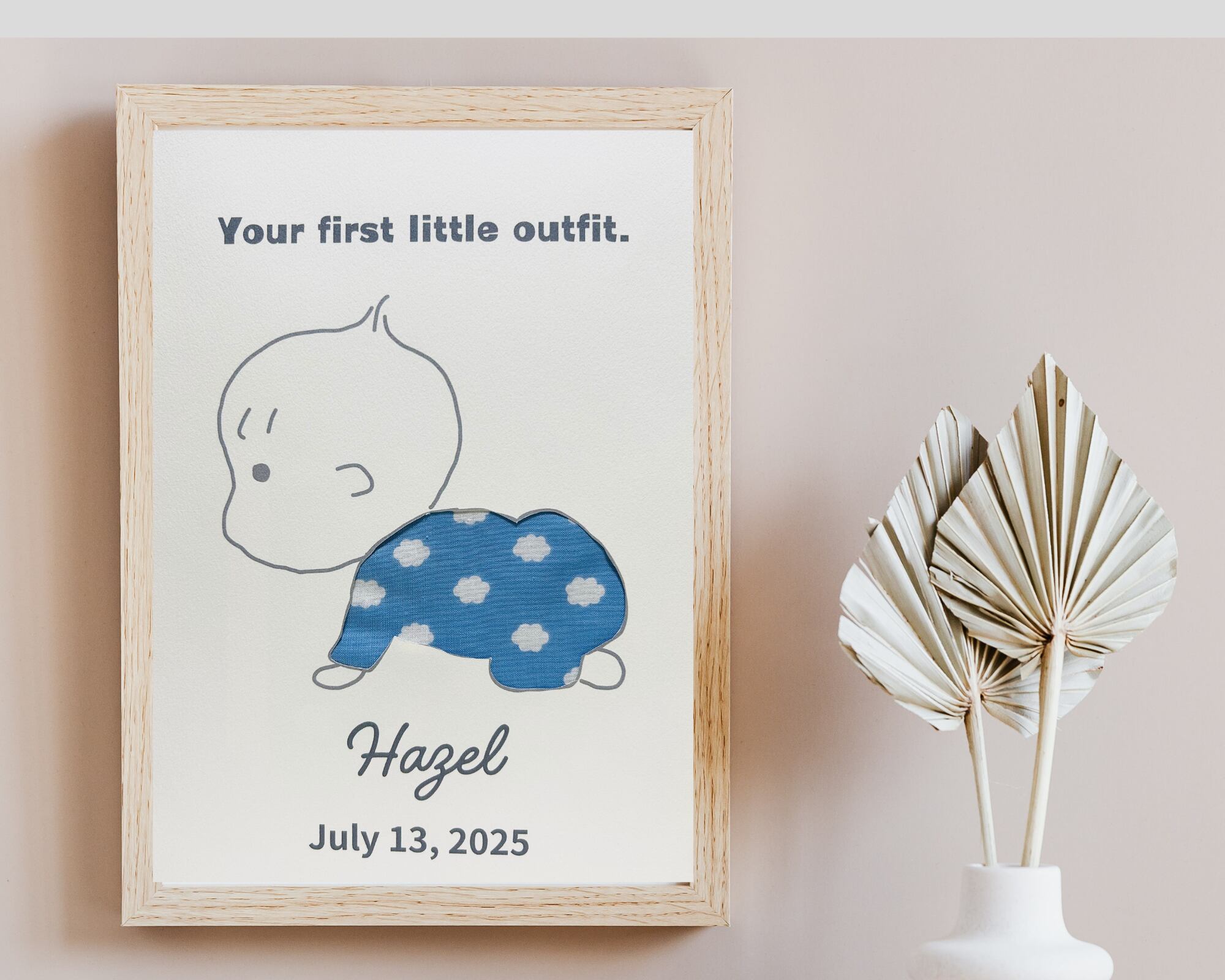 思い出の詰まったベビー服をずっと飾れる形に。お名前や誕生日を入れて、特別な思い出を残します。